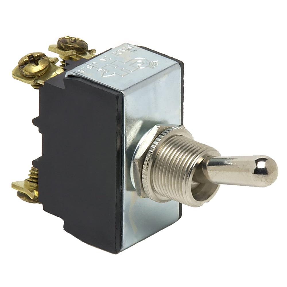 Cole Hersee's Heavy Duty DPST Toggle Switch, 4 Screw Terminals, 25 A Standard or long handle. Universal application. Silver contacts. Mounting stem is nickel-plated brass 15/32" -32 thread, 15/32" (11.9mm) long, and fits panels up to 9/32" (7.1mm) except where stated otherwise. phenolic housing, with plated steel cap. Nickel-plated brass mounting hardware. Blade terminals: .250 quick connect. Screw terminals: 6-32 screws. 25A at 12V, 15A at 24V, and 10A at 36V DC.