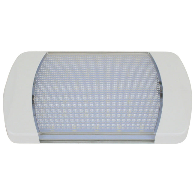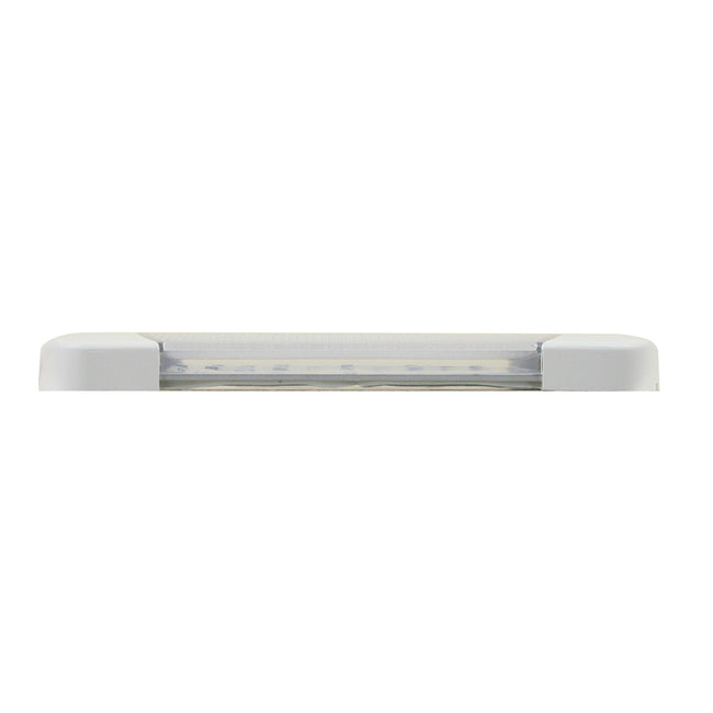 This is a surface-mount, low-profile E-330 LED compact engine room light. The white plastic end cap features a notch on the wire side to allow side access for the connection wires. A low-profile fixture extends a mere 5/8" from the mounting surface.
