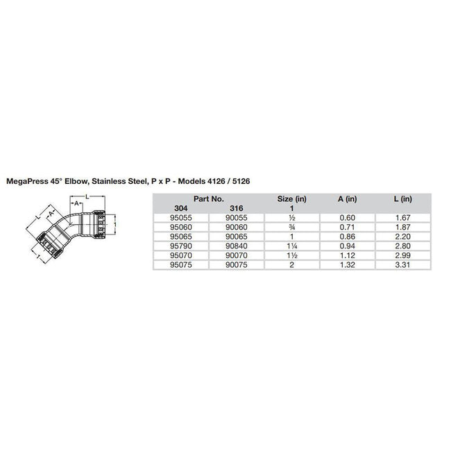 MegaPress 1/2" 45° Stainless Steel 304 Elbow - Double Press Connection - Smart Connect Technology