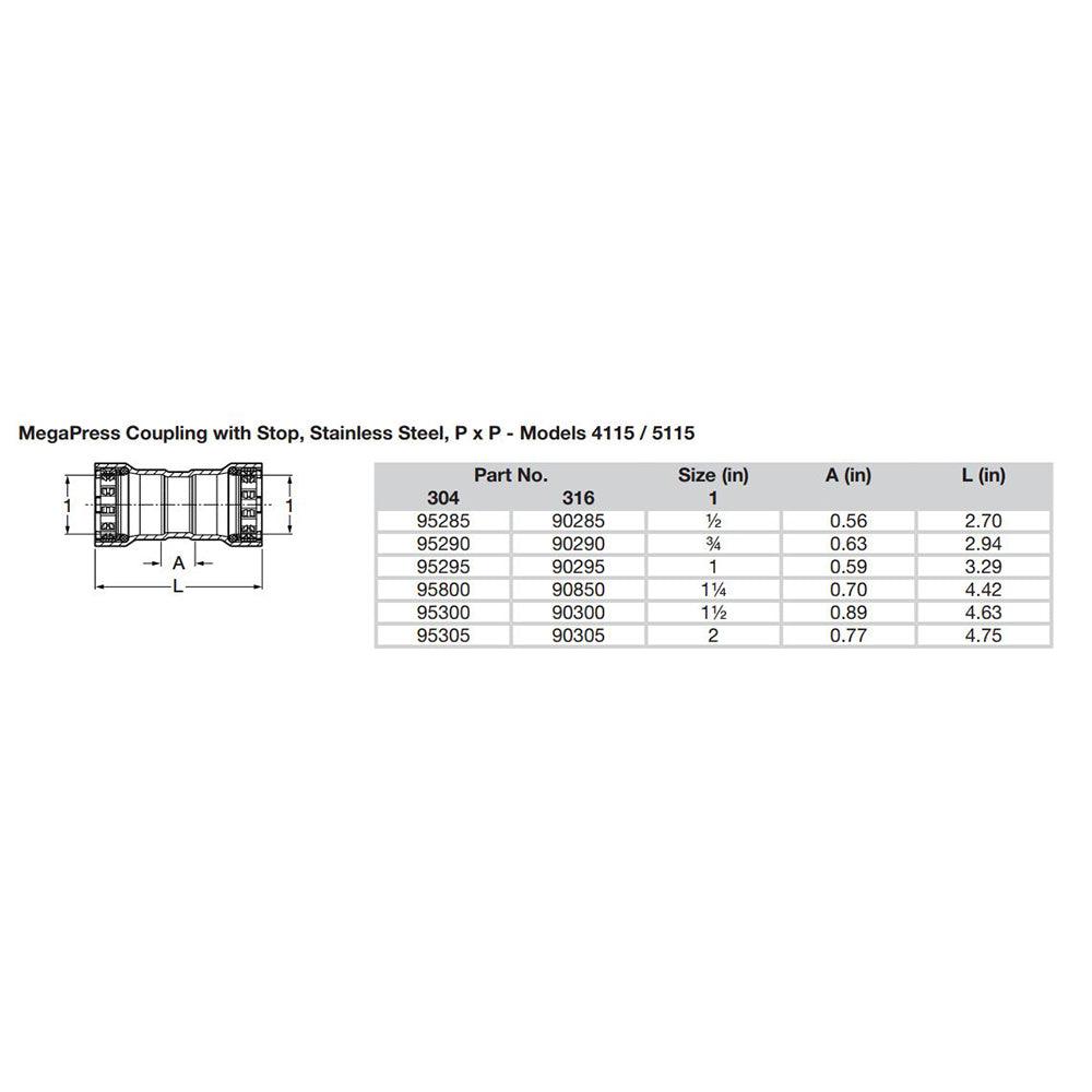 MegaPress 1/2" Stainless Steel 304 Coupling with Stop - Double Press Connection - Smart Connect Technology