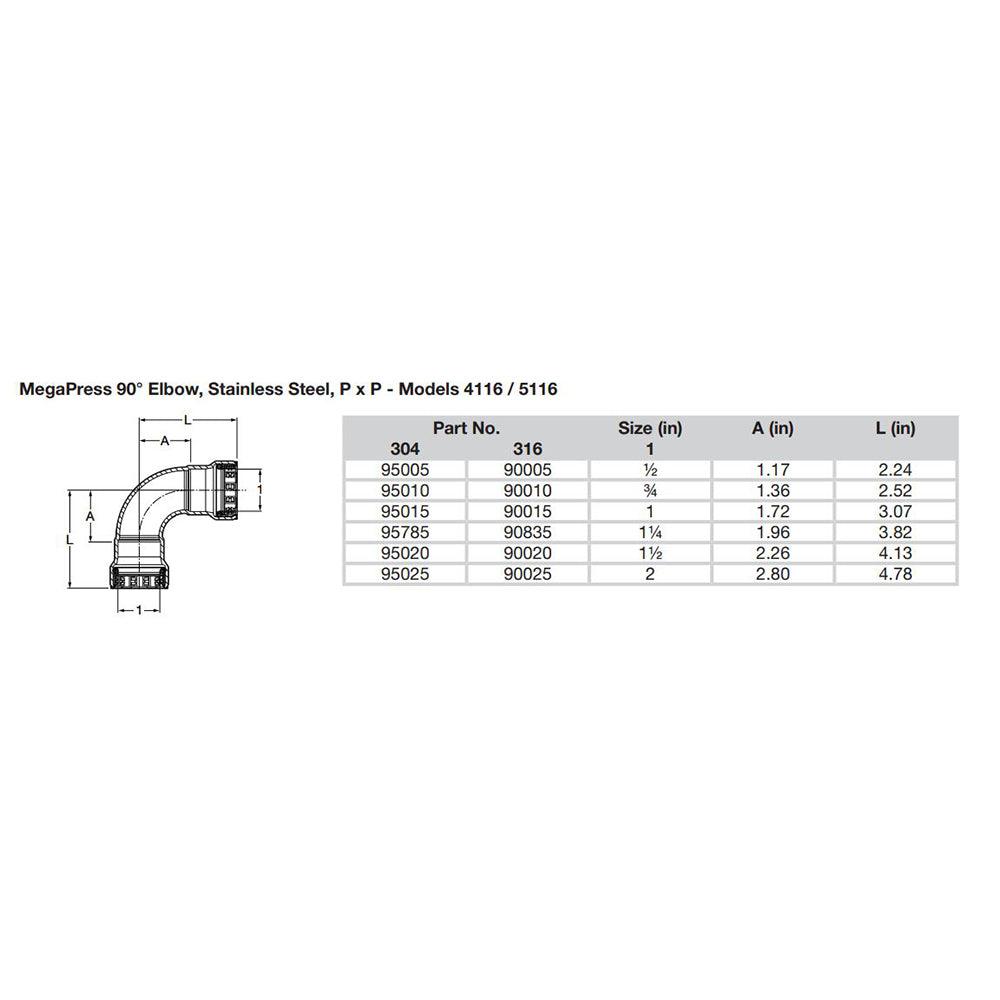 MegaPress 1" 90° Stainless 304 Elbow - Double Press Connection - Smart Connect TechnologyFeatures: 304 stainless Press connection Components:FKM sealing elements  Specifications: Construction: Stainless Steel Box Dimensions: 2"H x 3"W x 6"L WT: 0.85 lbs UPC: 691514950150 Quick Guide (pdf)Brochure...