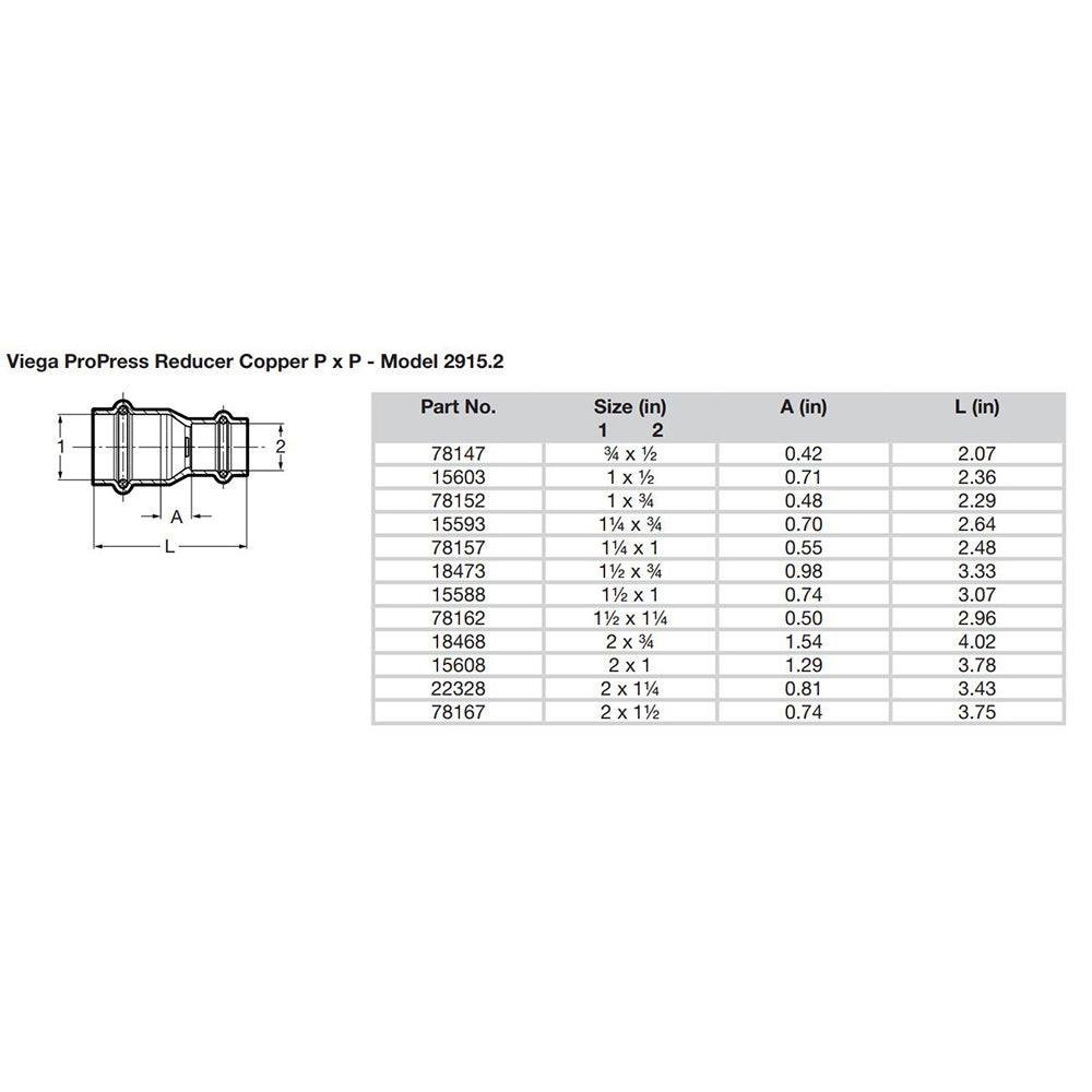 ProPress 1-1/2" x 1" Copper Reducer - Double Press Connection - Smart Connect TechnologyFeatures: For use with ASTM B88 tubing Copper Press connection Components:EPDM sealing elements Specifications: Construction: Copper Box Dimensions: 2"H x 2"W x 3"L WT: 0.4 lbs UPC:...
