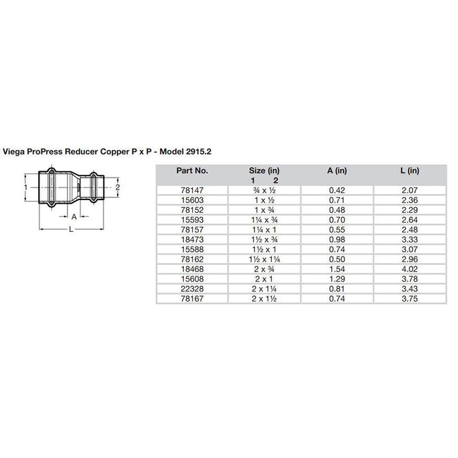 ProPress 2" x 1-1/2" Copper Reducer - Double Press Connection - Smart Connect TechnologyFeatures: For use with ASTM B88 tubing Copper Press connection Components:EPDM sealing elements Specifications: Construction: Copper Box Dimensions: 3"H x 3"W x 4"L WT: 0.65 lbs UPC:...