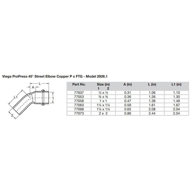 ProPress 3/4" - 45° Copper Elbow - Street/Press Connection - Smart Connect TechnologyFeatures: For use with ASTM B88 tubing Copper Press connection, street Components:EPDM sealing element  Specifications: Construction: Copper Box Dimensions: 1"H x 1"W x 3"L WT: 0.15 lbs UPC:...