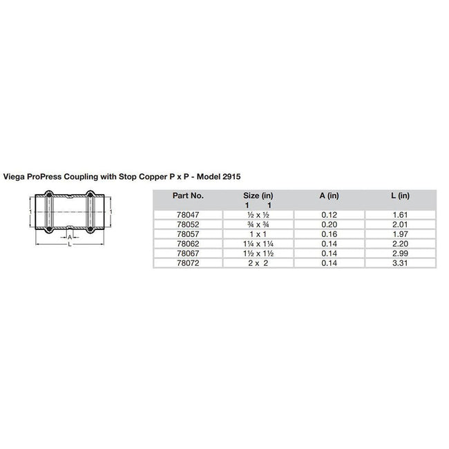 ProPress 3/4" Copper Coupling with Stop - Double Press Connection - Smart Connect TechnologyFeatures: For use with ASTM B88 tubing Copper Press connection Components:EPDM sealing elements Specifications: Construction: Copper Box Dimensions: 1"H x 1"W x 2"L WT: 0.15 lbs UPC:...